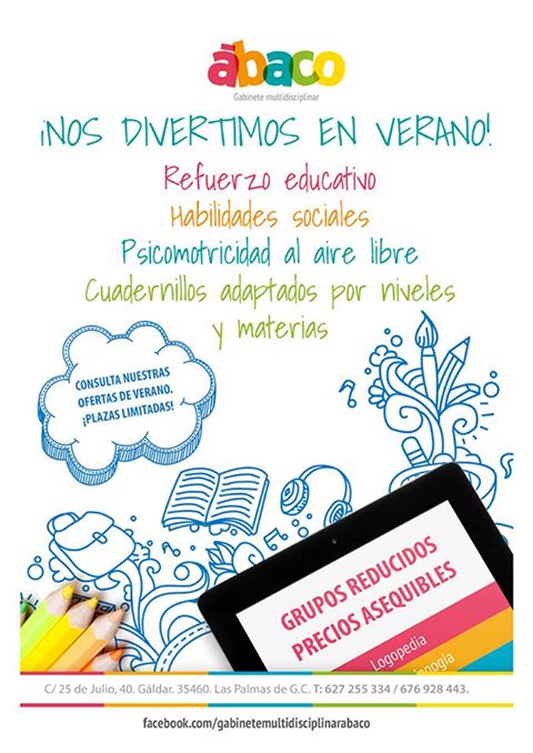 En otro orden de cosas, el Gabinete Multidisciplinar Ábaco pone en marcha el proyecto “Nos divertimos en Verano”, con el que pretende ofrecer una manera distinta de disfrutar y aprender a los niños y niñas en tareas como: refuerzo educativo y habilidades sociales todo ello con cuadernillos adaptados por niveles y materias.