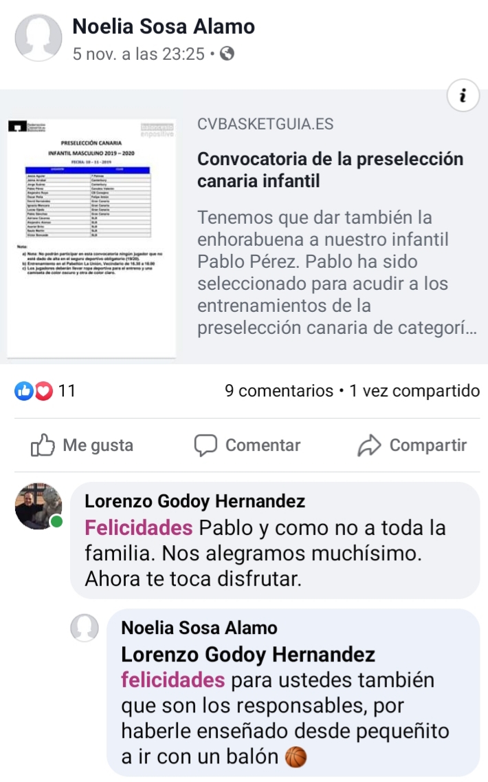 El CB Egonaiga se une a las felicitaciones recibidas por Pablo Pérez y su familia por su reciente convocatoria con la preselección de Canarias de su categoría.