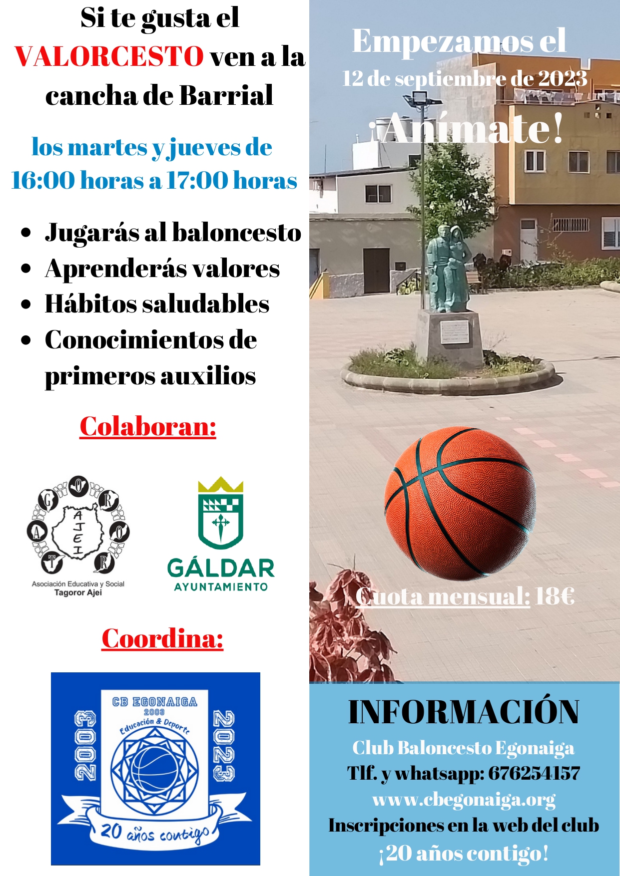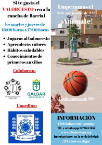 El CB Egonaiga y la Asociación Educativa y Social AJEI unen sus proyectos para llevar una oferta educativa y deportivo diferente al barrio de Barrial. El proyecto de Valorcesto Toba Pérez Guzmán será el nexo de unión entre ambas asociaciones que dará comienzo el próximo 12 de septiembre en la instalación deportiva de la Plaza José Rodríguez Quintana de 16:00 horas a 17:00 horas. La transmisión de valores a través del deporte, la práctica del baloncesto, los hábitos saludables y los conocimientos sobre primeros auxilios serán los pilares de la actividad de VALORCESTO en Barrial los martes y jueves de 16:00 horas a 17:00 horas. El club galdense y la Asociación Educativa y Social AJEI cuentan con la colaboración del Excelentísimo Ayuntamiento de Gáldar y de la Concejalía de Actividad Física, Salud y Deporte ya que estos aportarán las canastas para llevar a cabo la actividad que será del disfrute de los niños barrialenses.