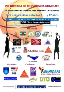 El pasado viernes, el CB Egonaiga y BaskIng organizaron la VII Jornada de Convivencia de Escuelas de Baloncesto en el CEIP San José Artesano. Los niños integrantes asistieron a dicha jornada con mucha ilusión y aguantaron el frío existente en la zona. Los más de veinte niños asistentes disfrutaron de los juegos planteados por Julián y Echedey, monitores de BaskIng. La diversión estuvo asegurada durante la hora y media que duró la cita.