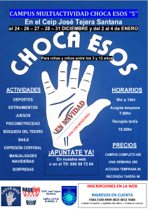 El CB Egonaiga y Eu Etopa organizarán por segundo año consecutivo el CAMPUS MULTIACTIVIDAD CHOCA ESOS CINCO en el CEIP José Tejera Santana los días: 24 – 26 – 27 – 28 – 31 de diciembre de 2018 y del 2 al 4 de enero de 2019 desde las 9 horas hasta las 14.00 horas con opción al servicio de acogida temprana (7.00 horas) y recogida tardía (15.00 horas).