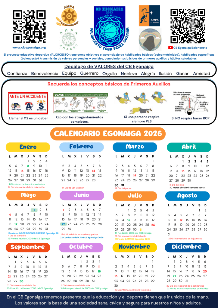 Nuestras actividades extraescolares en cada centro escolar y en el pabellón de la montaña han recibido el calendario 2026 del CB Egonaiga. En este calendario se recogen las fechas importantes del club, eventos de este año 2026, así como, fechas simbólicas a nivel mundial.