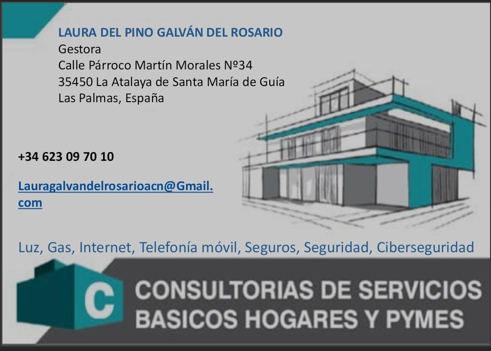 Laura Galván es gestora de la Consultorías de Servicios Básicos Hogares y Pymes. Laura hace un estudio de los gastos propios o esenciales del hogar o pymes: luz, gas, internet, telefonía móvil, seguros, seguridad y ciberseguridad. Para contactar con Laura pueden hacerlo a través del teléfono 623097010 o mail lauragalvandelrosarioacn@gmail.com