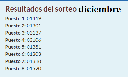 A continuación se relacionan los números premiados en el sorteo de noviembre. Recuerden que el puesto del número premiado se relaciona con el orden de los premios.