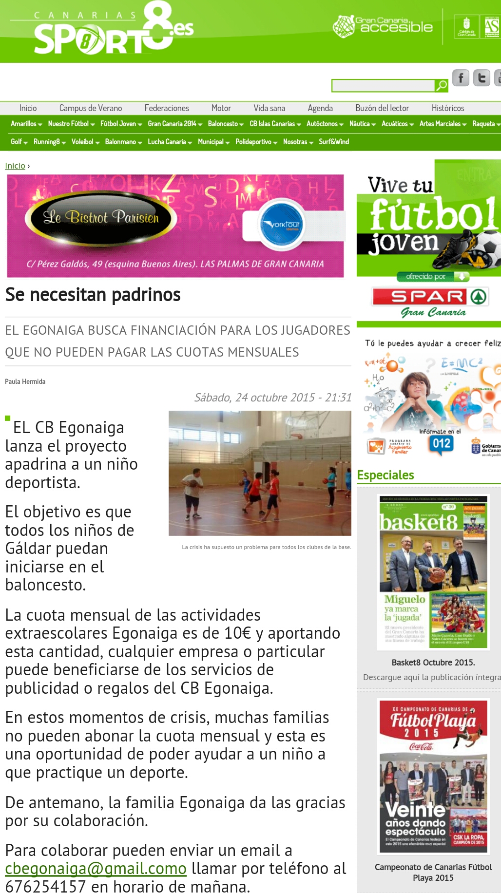Una vez mas, el periódico digital sport8.es recoge entre sus líneas una de nuestras noticias lanzadas la pasada semana. El proyecto «apadrina a un niño deportista» tuvo su protagonismo en el periódico baloncestístico del archipiélago. Por tan sólo 10€ cualquier empresa o particular puede hacer que un niño/a pueda pertenecer a una escuela Egonaiga de cualquier centro escolar de los municipios de Gáldar, Agaete o Santa María de Guía.