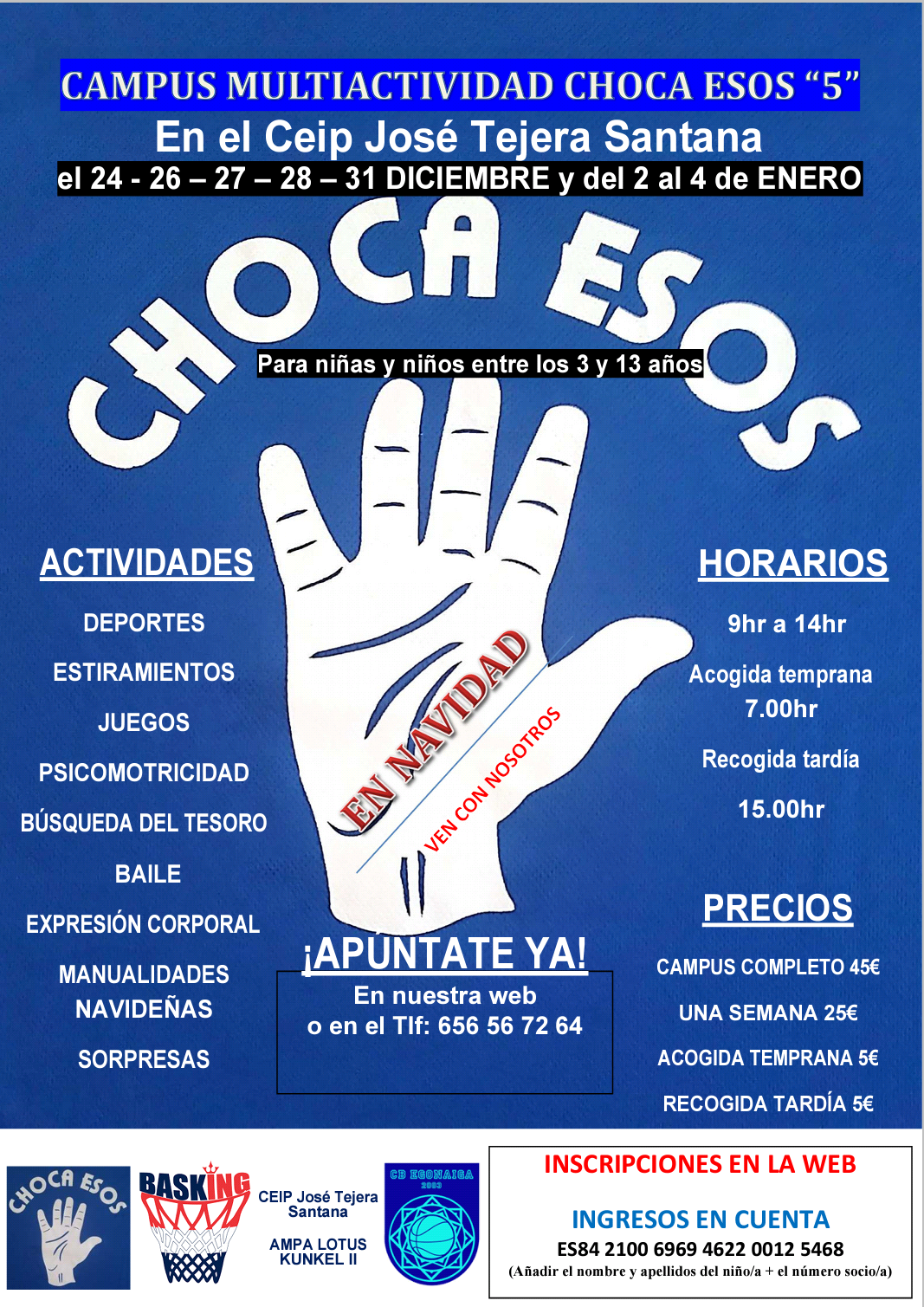 El CB Egonaiga y Eu Etopa organizarán por segundo año consecutivo el CAMPUS MULTIACTIVIDAD CHOCA ESOS CINCO en el CEIP José Tejera Santana los días: 24 – 26 – 27 – 28 – 31 de diciembre de 2018 y del 2 al 4 de enero de 2019 desde las 9 horas hasta las 14.00 horas con opción al servicio de acogida temprana (7.00 horas) y recogida tardía (15.00 horas).