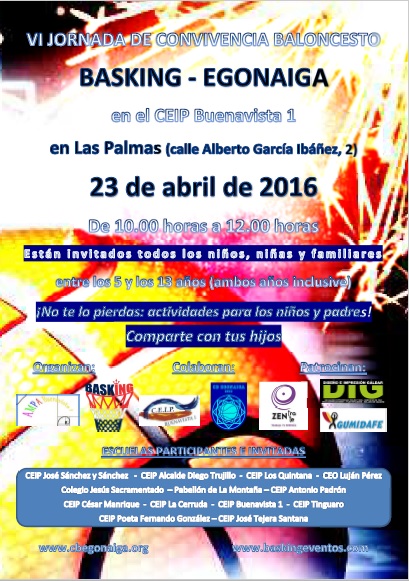 El próximo domingo, 22 de octubre, celebraremos la I Jornada de convivencia BaskIng – CB Egonaiga a las 10.30 horas hasta 12.30 horas. En esta cita asistirán todos los niños y niñas de todas las actividades extraescolares del CB Egonaiga y BaskIng. Sólo queda por confirmar el lugar de la jornada, ya que o bien puede ser en el CEIP Antonio Padrón o en el pabellón Juan Vega Mateos.